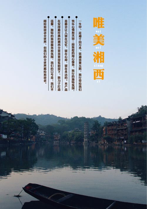 14:00:前往鳳凰(全程張花高速)—湘西天路,途觀世界奇觀,被譽(yù)為亞洲第一懸索橋的——矮寨特大懸索橋。晚上客人可根據(jù)自己的興趣愛好欣賞鳳凰沱江迷人的夜景,體驗(yàn)?zāi)切[而不失浪漫之情調(diào)。